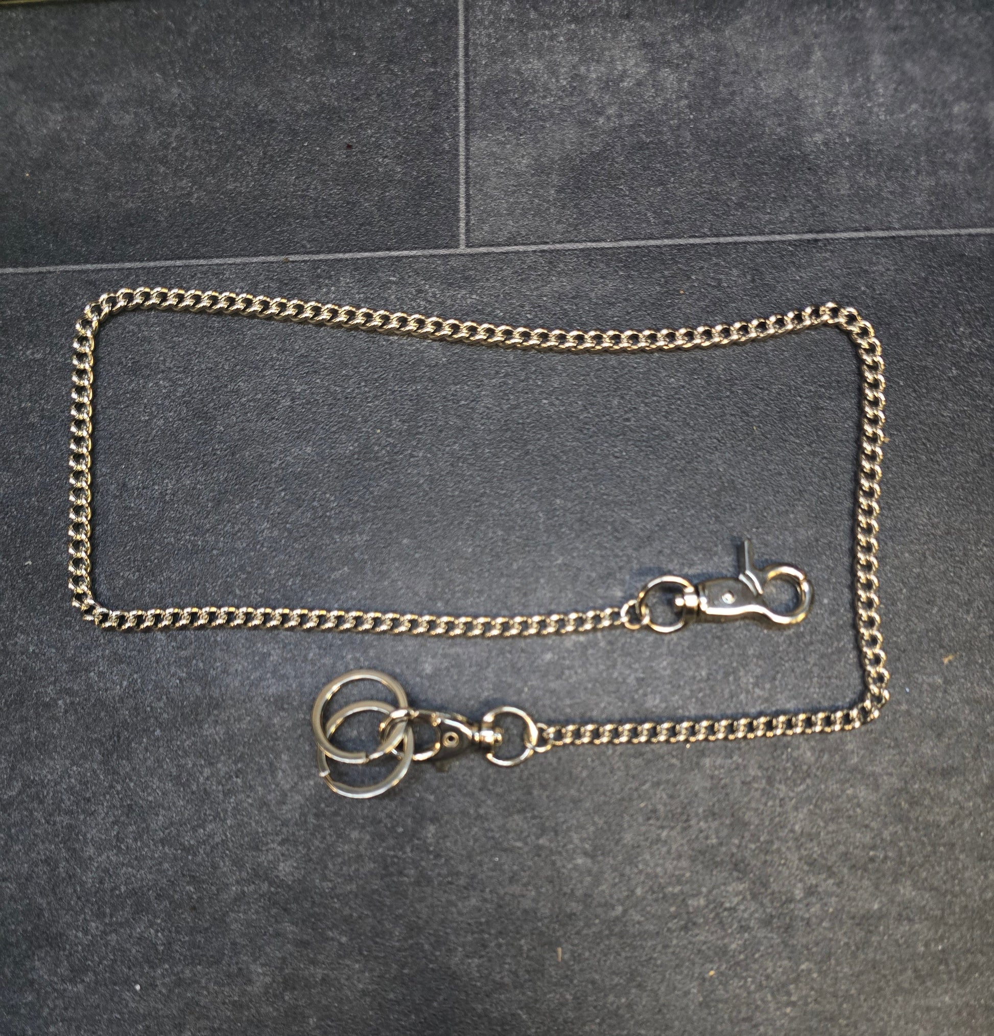 Keep your keys, wallet or accessories attached to you with a metal jean chain. Clips on each side with 2 keyring hoops.